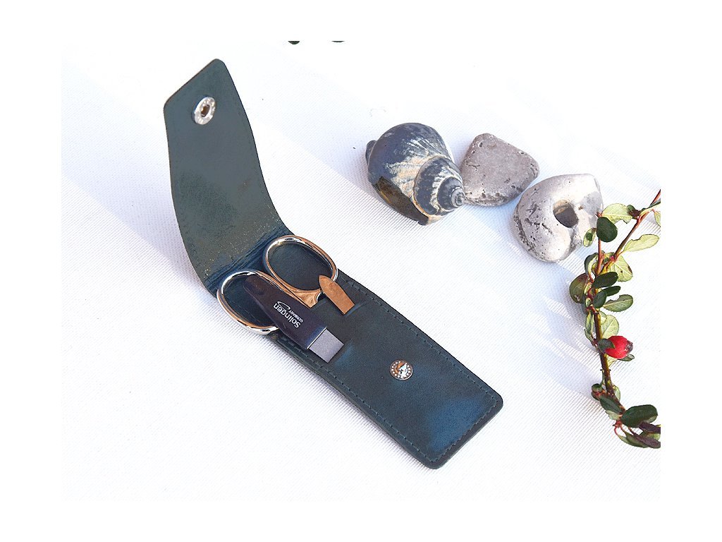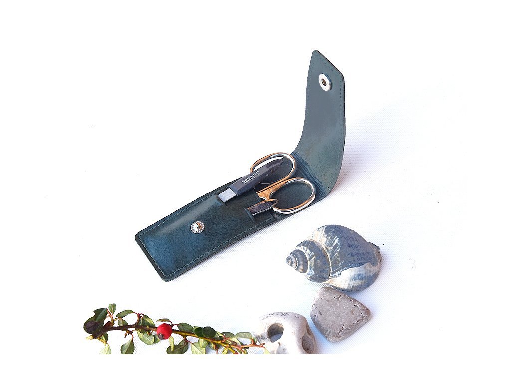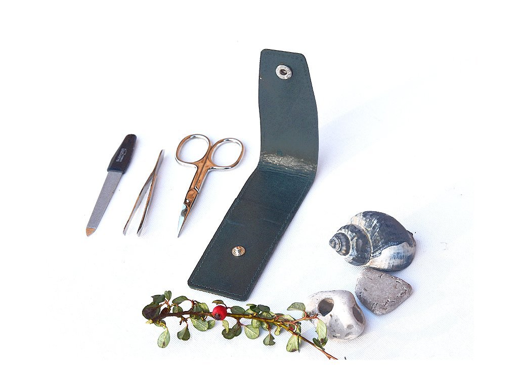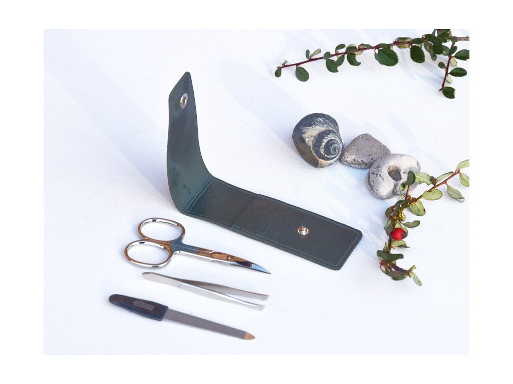 Stalowy zestaw do manicure osobistego z pilnikiem, pęsetą i nożyczkami. Zawsze gotowy do podróży w skórzanym etui.