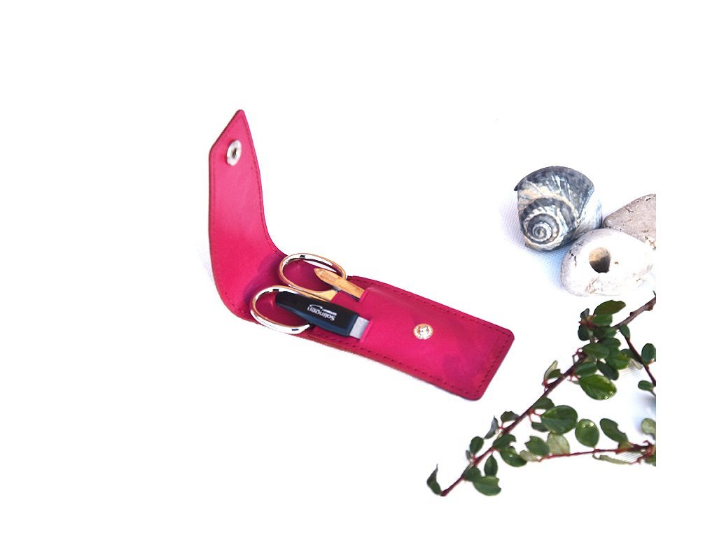 Stalowy zestaw do manicure osobistego z pilnikiem, pęsetą i nożyczkami. Zawsze gotowy do podróży w skórzanym etui.