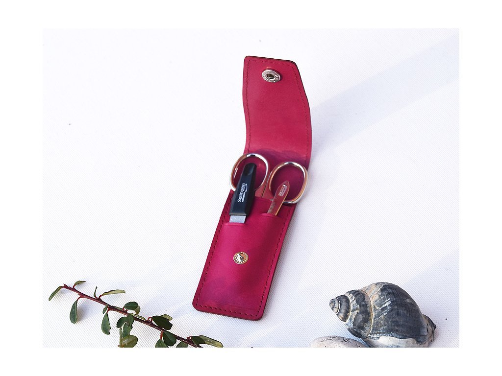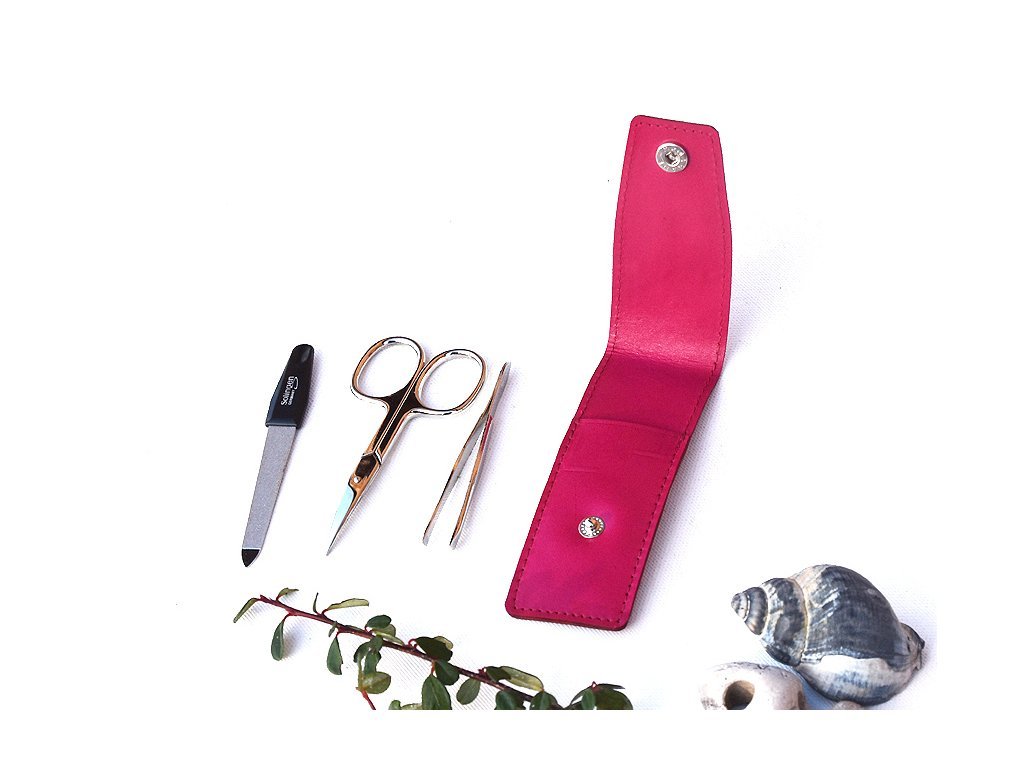 Stalowy zestaw do manicure osobistego z pilnikiem, pęsetą i nożyczkami. Zawsze gotowy do podróży w skórzanym etui.