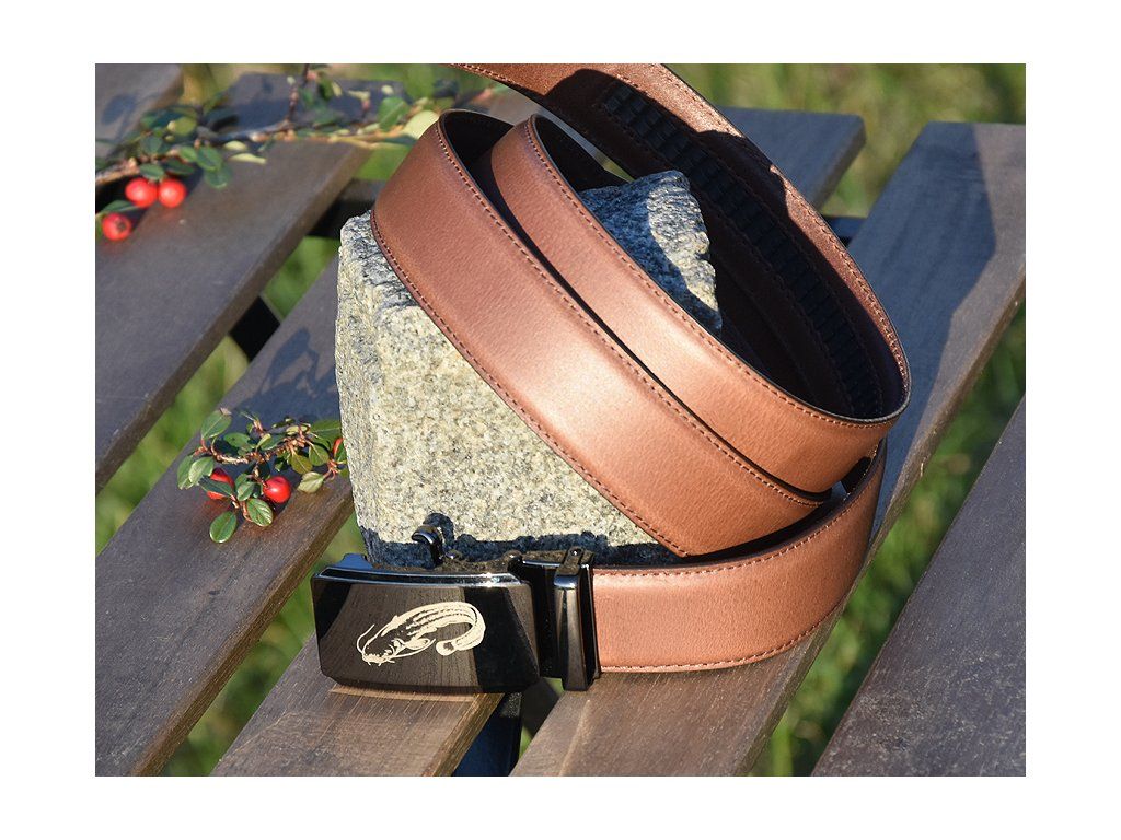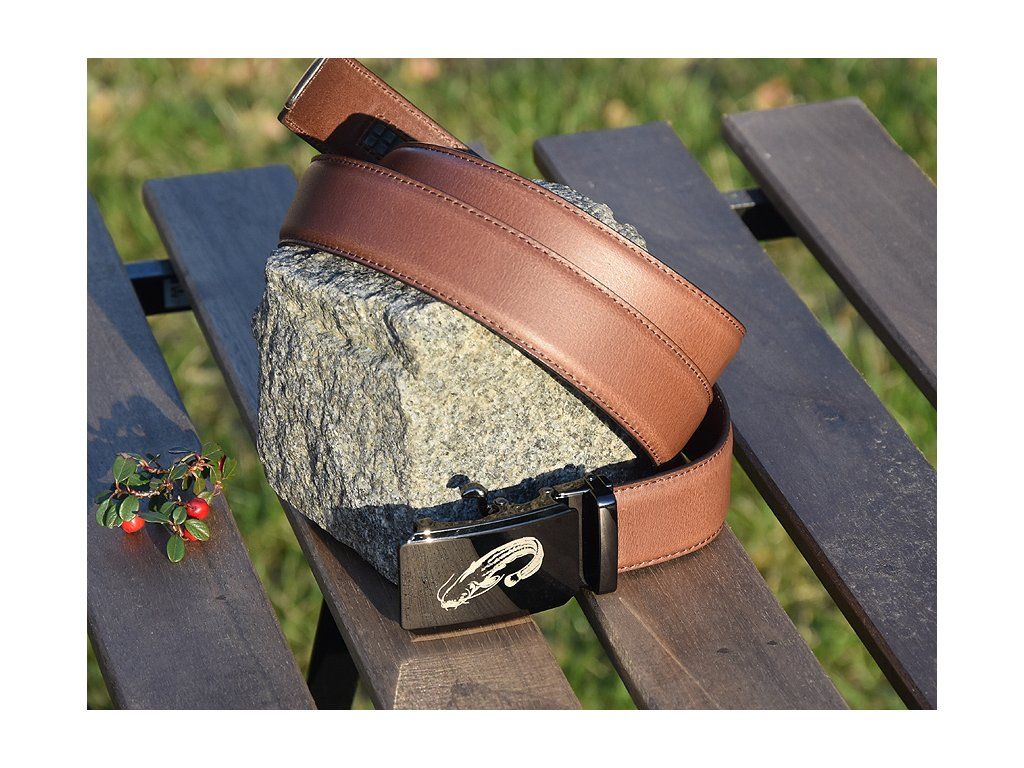 Skórzany pasek z wygrawerowanym motywem na klamrze. Nadaje się również do garnituru, munduru.
