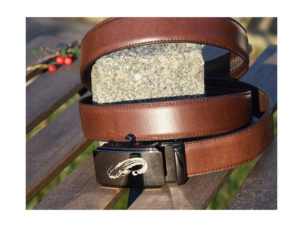 Skórzany pasek z wygrawerowanym motywem na klamrze. Nadaje się również do garnituru, munduru.